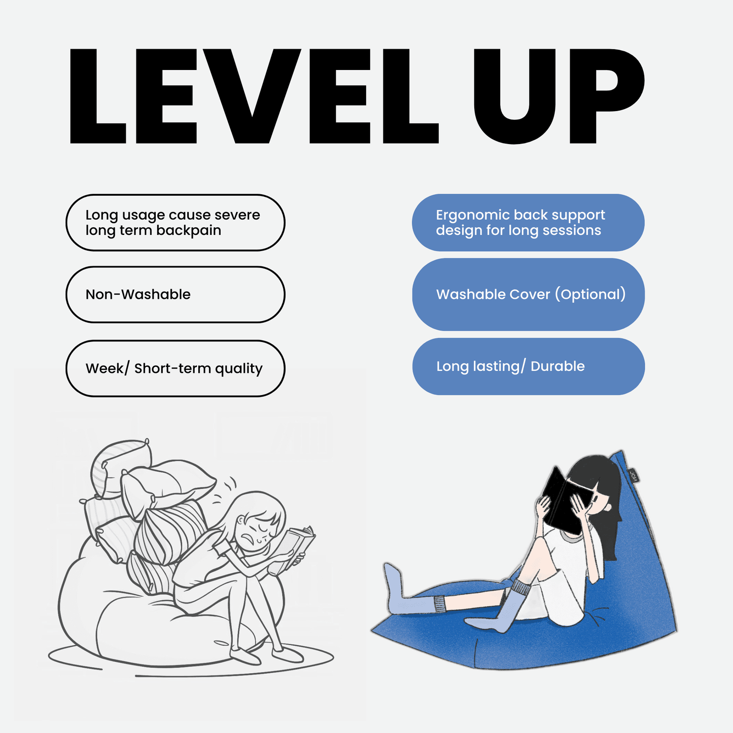 Personalice su nivel de comodidad ajustando la cantidad de relleno. Recomendamos usar 2 kg de poliestireno o 3,5 metros cúbicos de espuma viscoelástica triturada. Nuestra práctica videoguía le guiará paso a paso por el sencillo proceso de llenado. Haga clic aquí para ver el video.