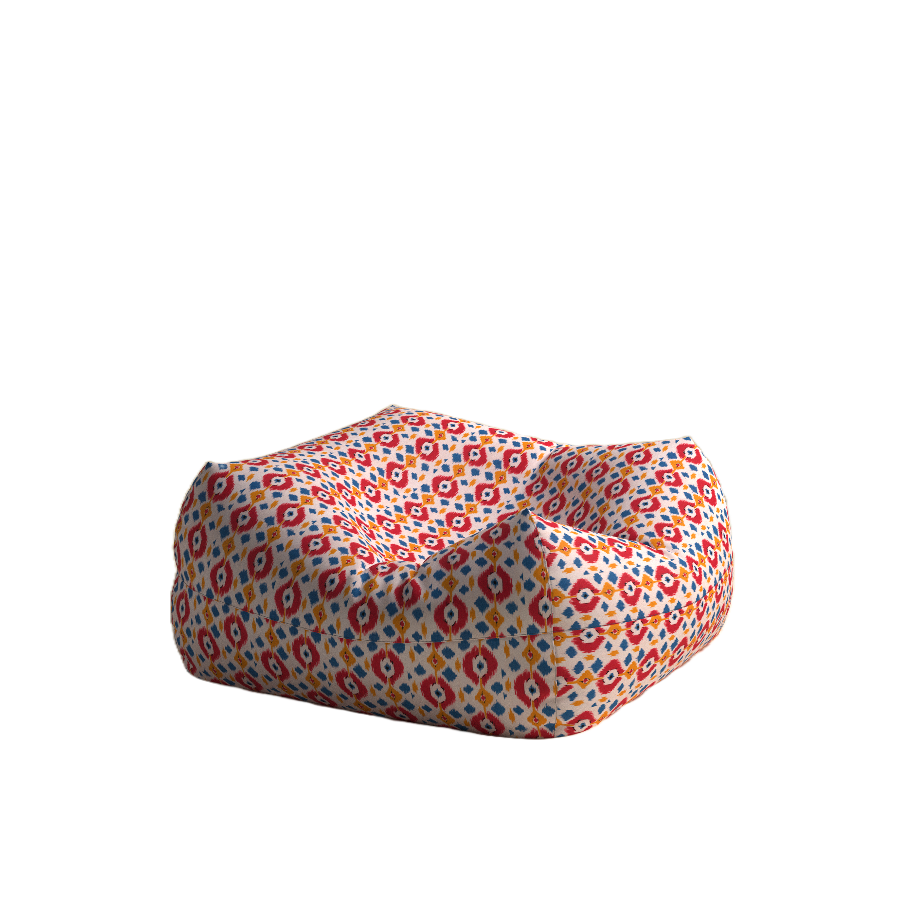 Introducing our Durable Multicolour Geometric Floor Pouf, crafted from durable cotton with a vibrant geometric pattern.\nPerfect for indoor use, its cute square shape effortlessly fits into small spaces and corners. With a full-width zipper for easy bean filling and strong velcro closure to keep fillers secure, this pouf offers both style and functionality to any room in your home.\n\nIn the box: Bean Bag x 1 (Fillers are not included)